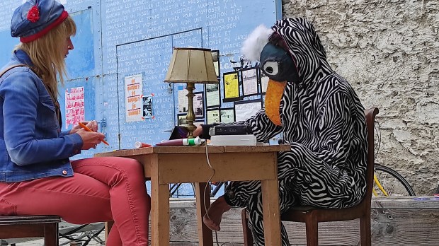 Super! Comme quoi la Ville de Grenoble produit des artistes qui sont des experts en rencontres de ce type… J’ai longtemps fréquenté une personne (Lucie B.) devenue une amie qui avait un stand itinérant de ce style et qui elle, rédigeait à partir de récits personnels des cartes postales adressées à un destinataire désigné par l’auteur du récit. Je lui avait trouvé plusieurs points de chutes, notamment via une amie qui travaillait dans un centre de rééducation fonctionnelle, En effet, il me semblait que le récit des personnes affectées par un accident et/ou une maladie était approprié…